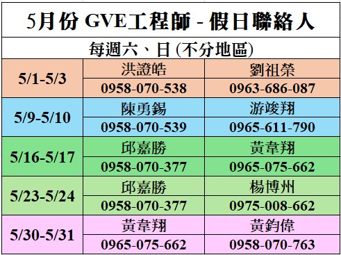 2026年5月份假日聯絡人請參照下方內容。